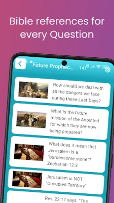 Here is a list of all categories that the app includes: Parables,Past and Present Prophesies,Future Prophecies,Prayer,Occult, Magic, Spiritism,Miscellaneous Bible Questions,Mosaic Law, Tabernacle, Tithes,Marriage,Miracles,Life Decisions and Doing the will of God,Kingdom and the Millennium,Judgment,Jesus’ Life, Teachings, and Death,Israel, Middle East,The Holy Spirit,God, Faith,Heaven and Earth,Hell, Death/Grave,Creation, Evolution,Chronology,Church history, False church,Church and The Bride of Christ,Christian Character and Conduct,Baptism,Bible and Bible Characters,Antichrist,Angels, Spirit Beings,Trinity,Resurrection, Eternal life, Immortality,Revelation,Sabbath,Religions,Salvation, Ransom and Restitution,Satan,Jesus’ Second Advent, Rapture,Soul