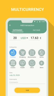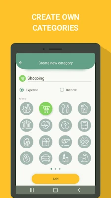 Use ready templates (such expenses as grocery, hobby, utility bills, etc.) or create your own categories, choose any colors and entitle them to adjust the app as you see fit and get the most out of it;
